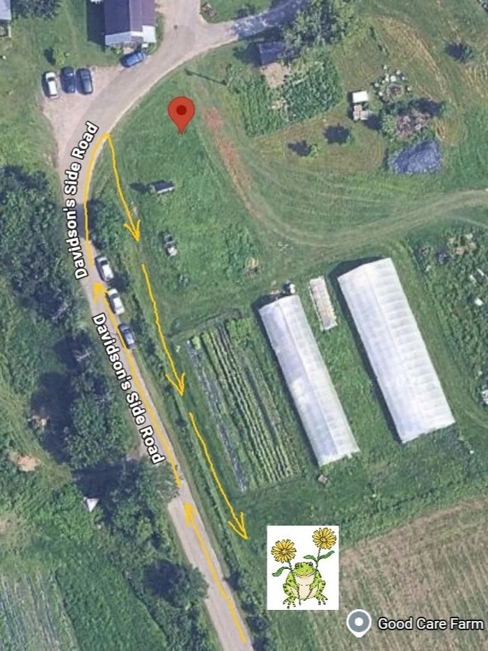Located at 230 Davidson’s Side Rd (drive to the end of Davidson’s side Rd., then walk down to the first field below the greenhouse - follow the directions below and the colourful banners when you get here!